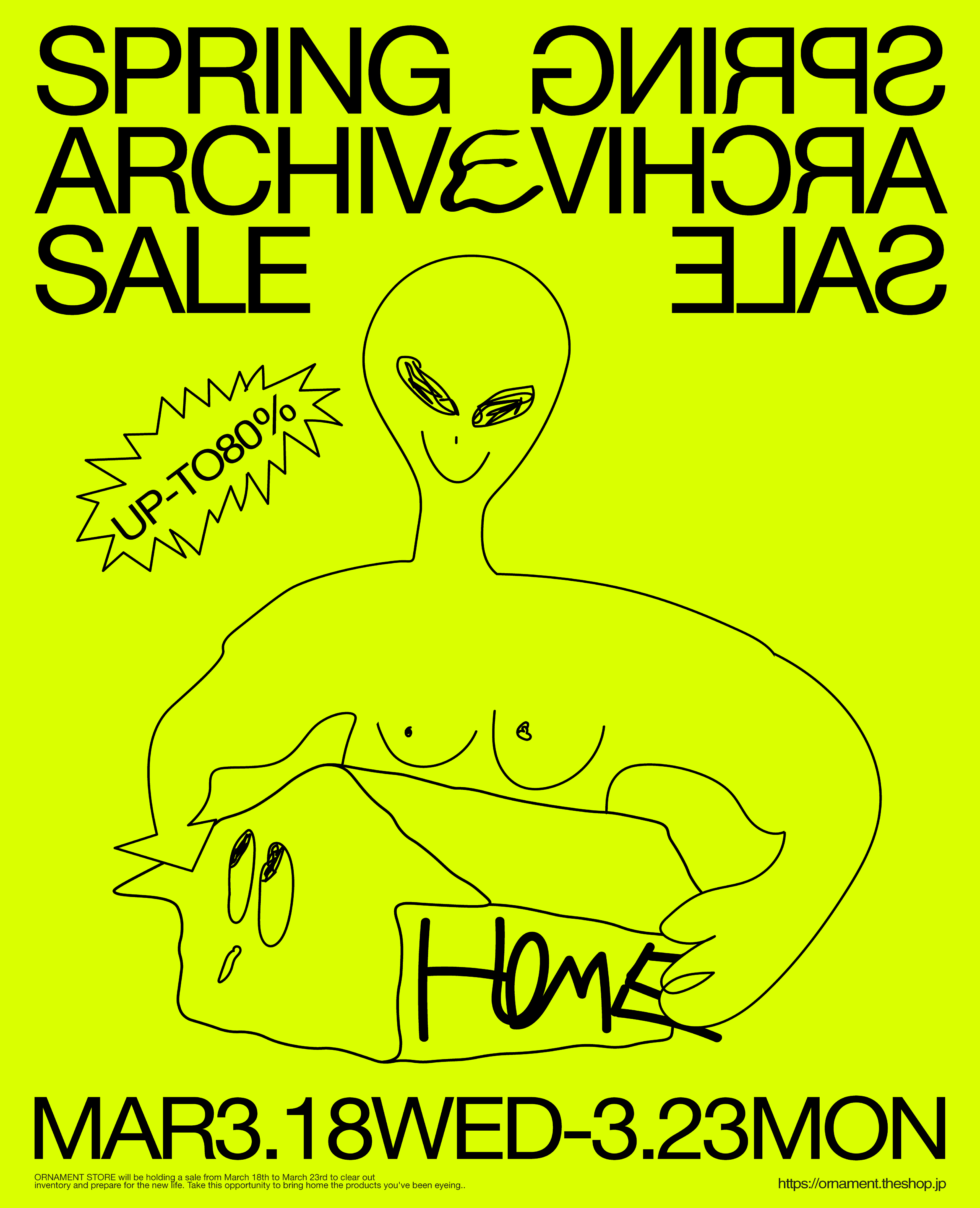 ORNAMENT STORE SPRING ARCHIVE SALE UP-TO 80% 3.18(WED)17:00 -3.23(MON)23:59 ※Limited to 6 days only ※NEXT SHIPPING DAY 3.24(TUE)