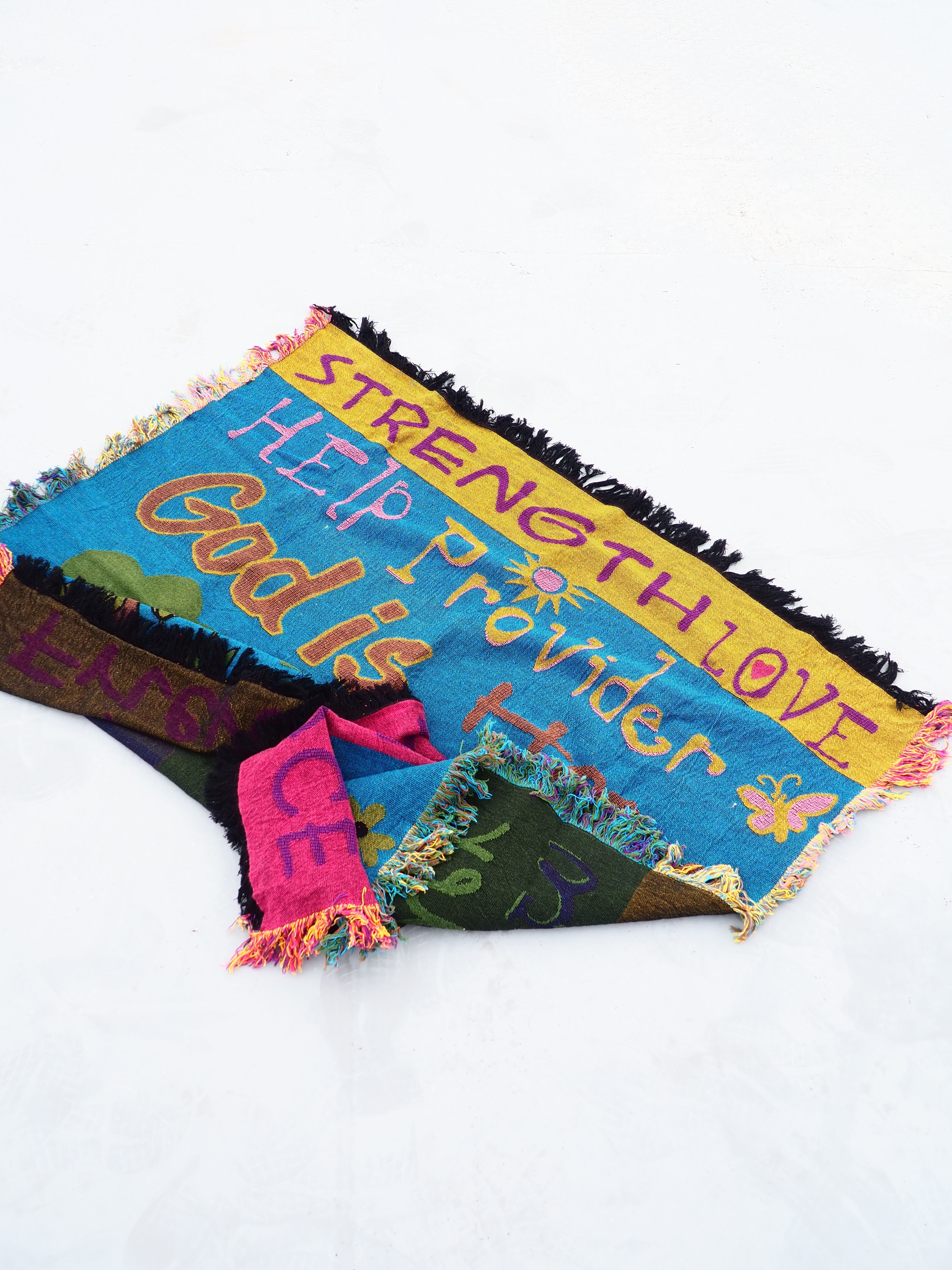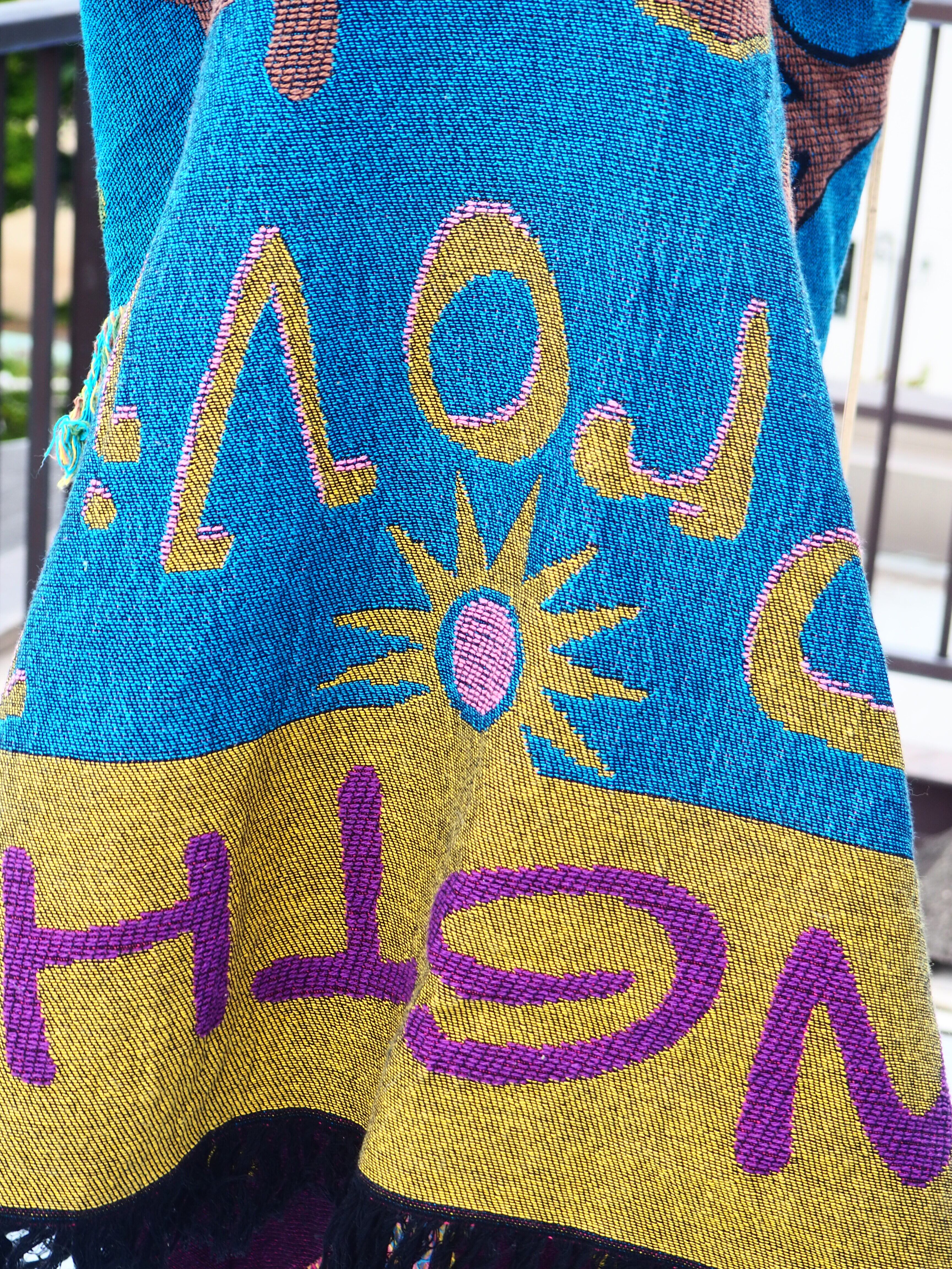 いろんな意味の文字やイラストが描いてあるクールなブランケットです。正方形に近いサイズ感です。是非!